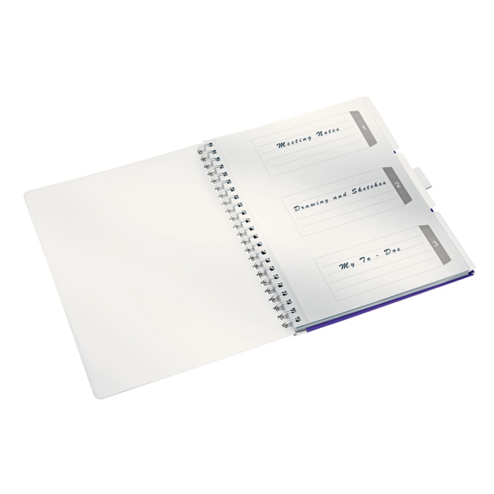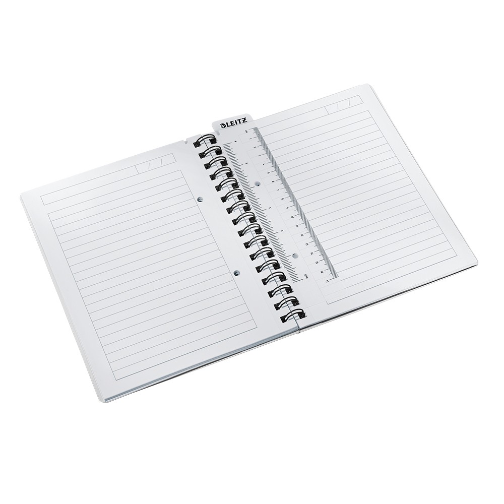 Caiet de birou Leitz WOW Be Mobile. Ideal pentru a lua notite atunci cand esti in miscare. Coperta din polipropilena, 80 de file, hartie 80 g/mp, certificata FSC, 3 separatoare repozitionabile si pagina de sumar, mapa cu 3 clape atasata pe coperta din spate, capacitate 60 de coli.