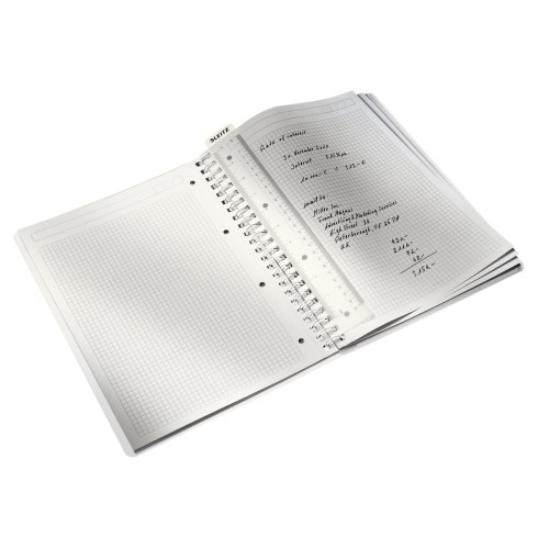 Coperta din polipropilena, 80 de file, hartie 80 g/mp, certificata FSC. Prevazut cu rigla gradata ce poate fi folosita si ca semn de pagina si buzunar pe coperta din spate pentru stocarea temporara a documentelor.