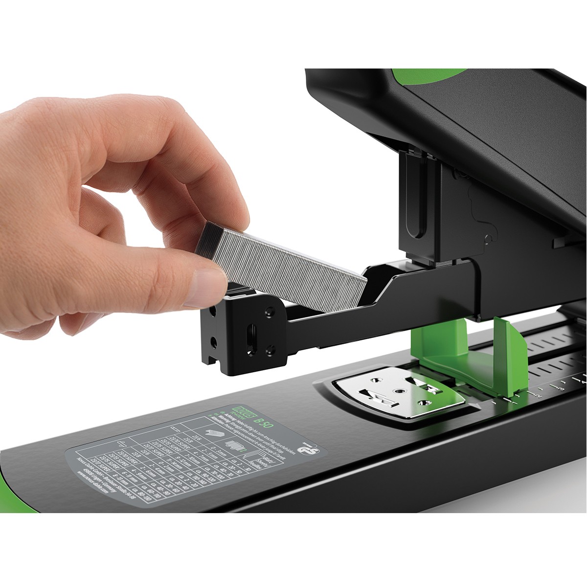 Perforator de birou durabil pentru utilizare grea pentru pana la 140 de coli de hartie cu sistem anti-blocare (ABS) pentru capsare convenabila, fara probleme. Dispozitiv complet metalic in carcasa din plastic.