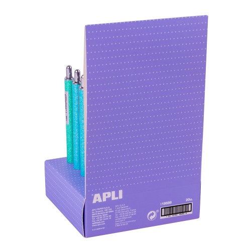 Pixuri cu cerneala uleioasa si varf de 1 mm de culoare albastra. Fiecare afisaj contine 20 de pixuri, 5 unitati pe culoare: sclipici roz, albastru, argintiu si turcoaz.
