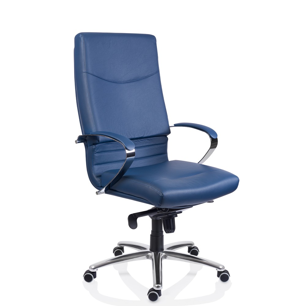 Fotoliu directorial, mecanism multibloc, interior din lemn stratificat tip monoscoică, brațe cromate tapițate, bază ALU șlefuit.