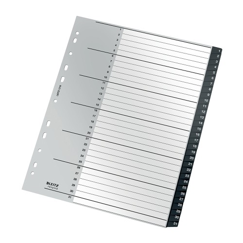 Index Leitz din plastic de calitate superioara, format A4 MAXI si taste numerice de la 1 la 31. Fabricat din plastic 90% reciclat cu impact neutru asupra mediului, fiind 100% reciclabil. Permite o organizare si utilizare clara a documentelor indiferent daca sunt pentru scoala, munca sau acasa. Index robust si durabil ce se potriveste perfect cu celelalte produse din gama Leitz Recycle. Produse verzi ce arata grozav in biroul de acasa sau de la munca. Cu noua gama Recycle de la Leitz imbunatatesti atat mediul biroului tau, cat si mediul inconjurator.