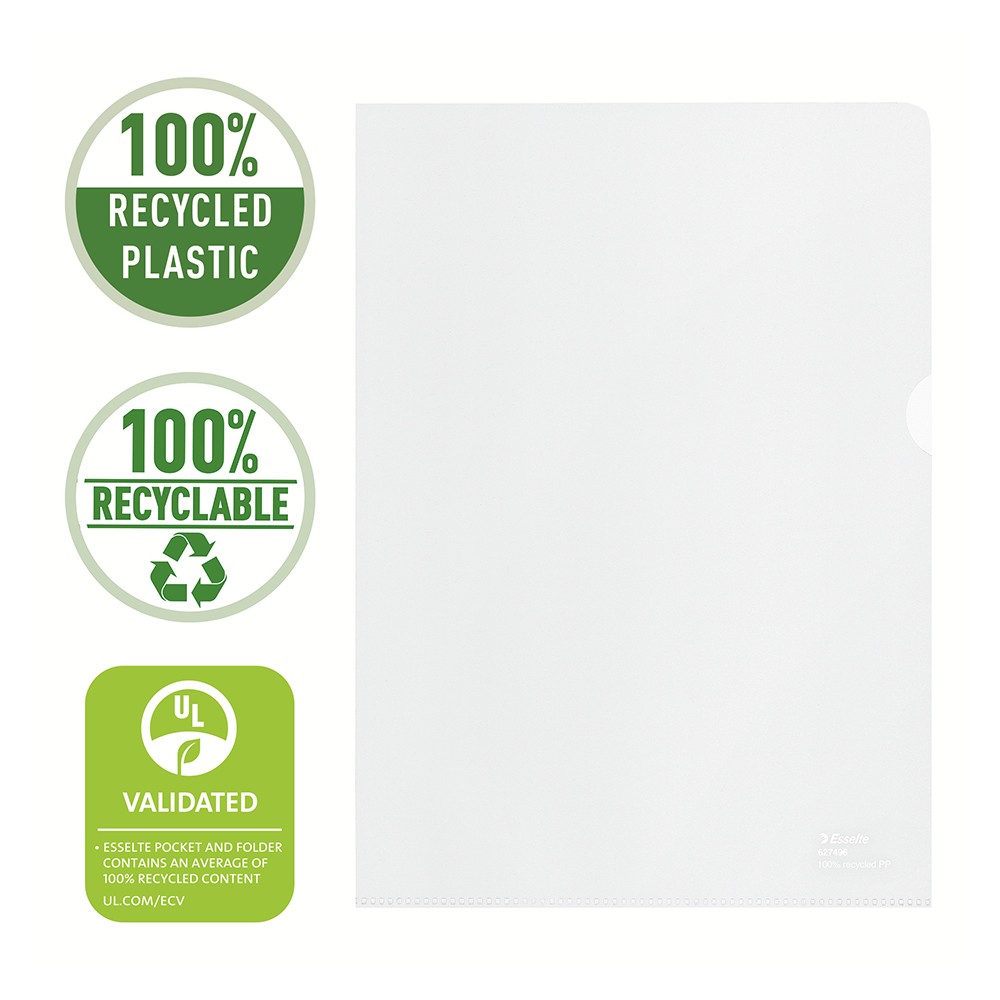 Mapa de protectie Esselte A4 nedaunatoare mediului, pentru folosirea zilnica, creata din material rezistent 100% reciclat PP. Pentru protejarea documentelor atunci cand esti in miscare, sau acasa. Produsul poate sa fie refolosit si reciclat din nou. Mapele de protectie sunt ambalate in cutie de carton care este de asemenea 100% reciclata si reciclabila. Confectionat in Europa. Continut reciclat confirmat de UL.