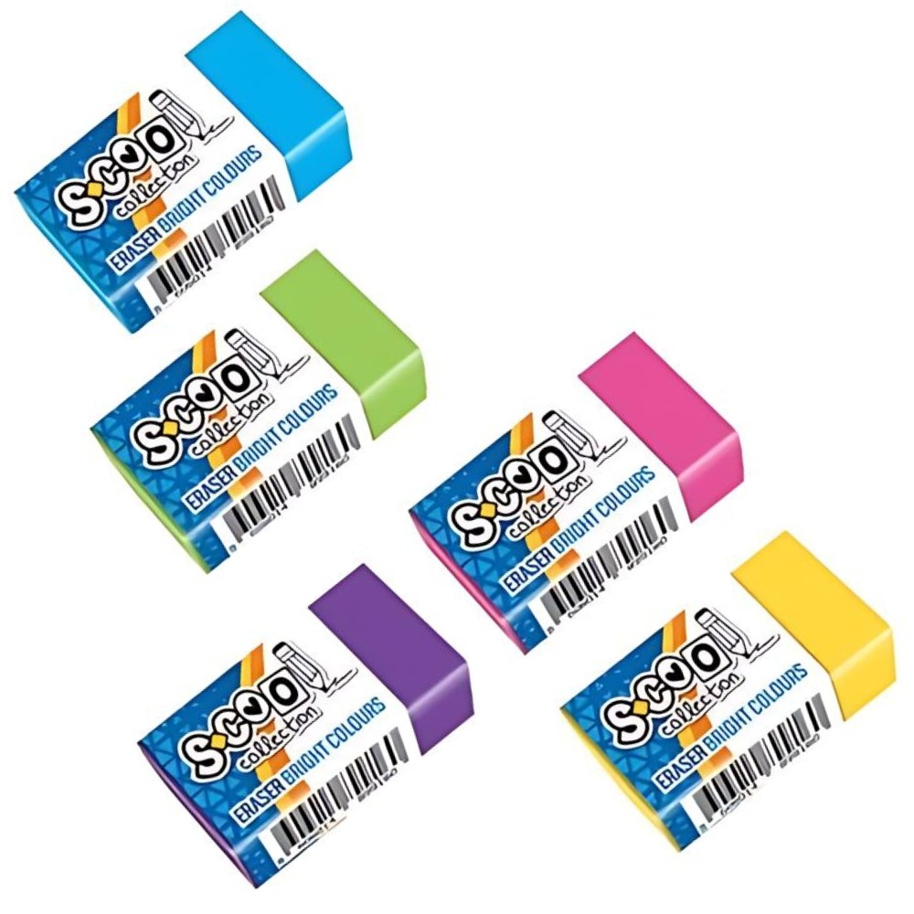 - Cutia contine 30 radiere in 5 culori: galben, verde, roz, albastru, mov.