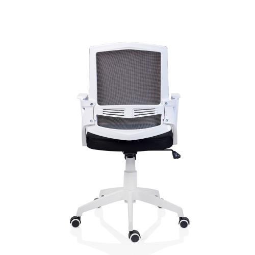 Scaun ergonomic rotativ cu elemente din polipropilena albe, mecanism oscilant cu functie de balans si blocare a sezutului in pozitie orizontala, spatar tapitat cu mesh gri si sezut tapitat cu material textil negru, baza polipropilena alba 600 mm, cilindru cu gaz, acoperitor cilindru alb, role gumate pentru parchet sau mocheta, brate fixe incluse.