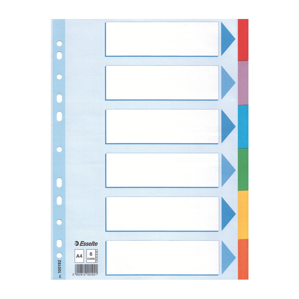 6 separatoare. Carton reciclat. Certificare Blue Angel. Carton 160 gsm. Format A4. Multicolor.