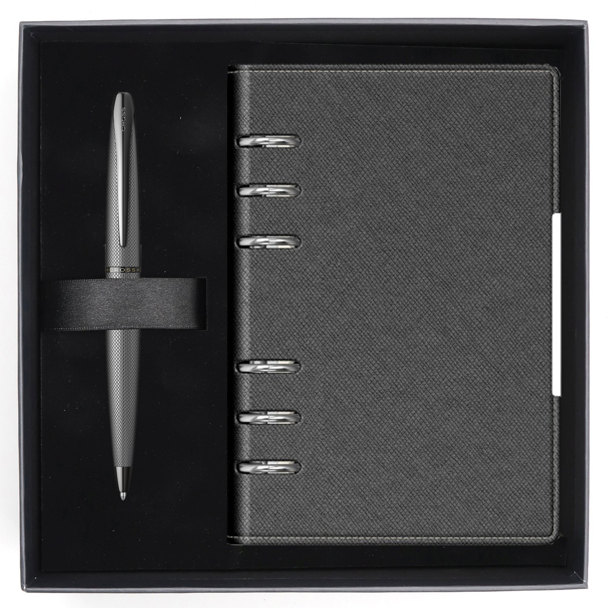 Organizer cu mecanism tip caiet mecanic 6 inele, format B6, coperta imitatie piele, rizata, cu ornament metalic vertical, 2 buzunare interioare, 115 pag. hartie ivoire 80 g/mp
