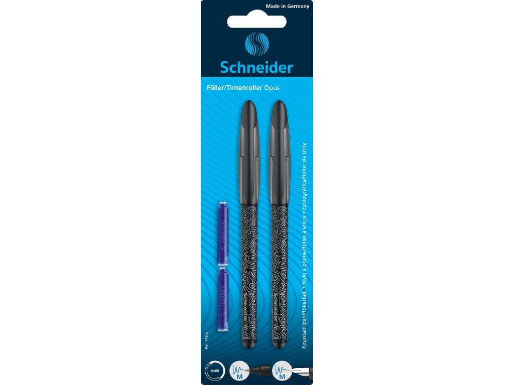 Noile modele de stilouri și rollere Schneider Opus, oferite la set, au un design actualizat, contemporan, cu elemente grafice argintii, subtile, aplicate pe corpului instrumentului de scris ce ne este prezentat în trei culori: negru, verde și bordo.
