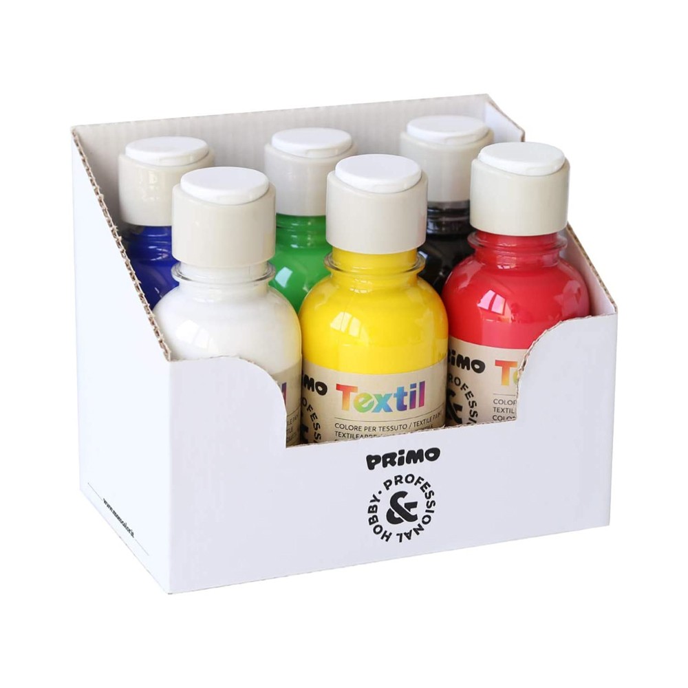 Vopselele pentru tesaturi Primo sunt intense si stralucitoare si pot fi diluate dupa dorinta. Setul contine 6 culori acrilice: alb, galben, rosu, albastru, verde deschis, negru.