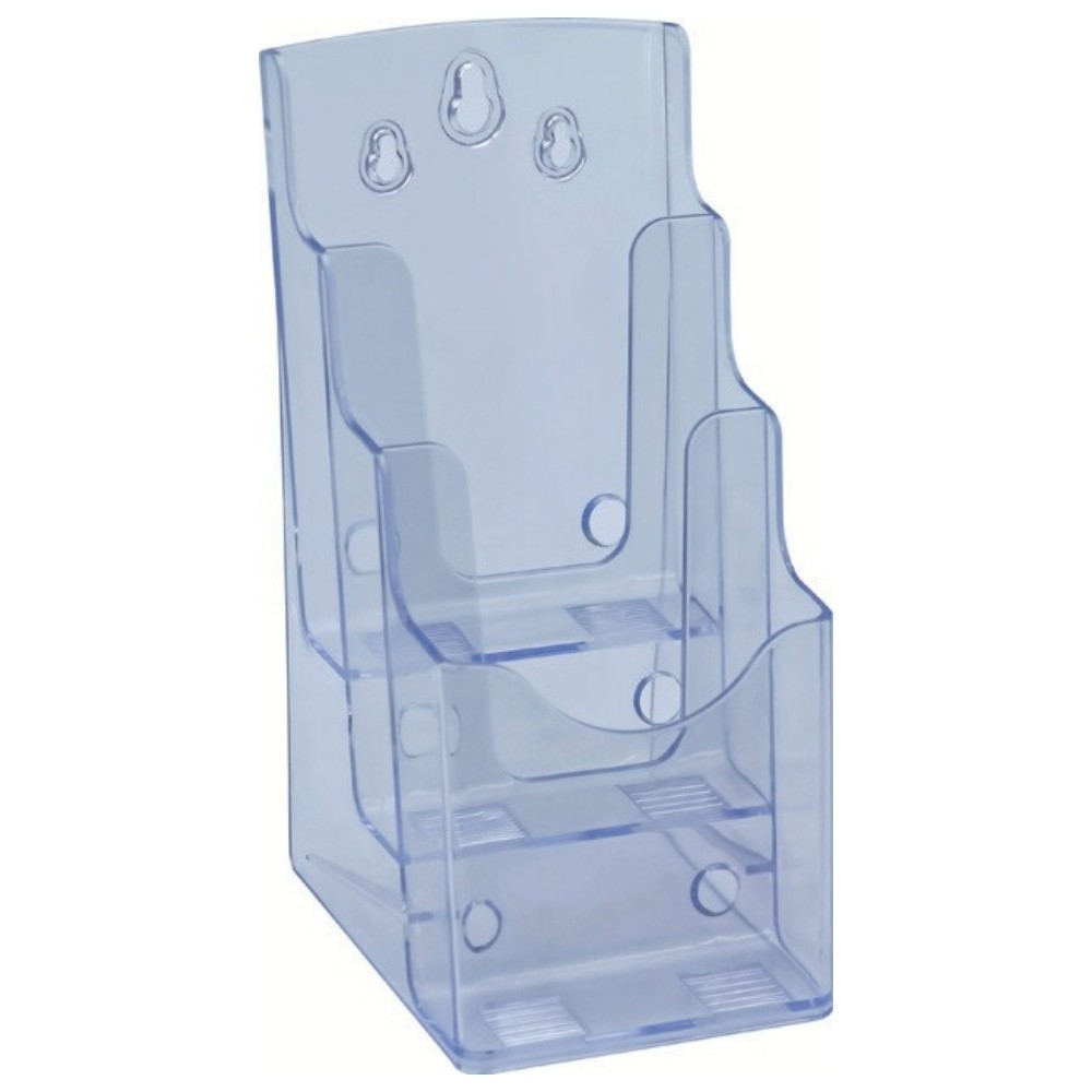 Suport pentru brosuri/pliante Forofis, format portrait, dimensiune A4 (1/3), cu 3 compartimente (3T), conceput pentru organizarea eficienta a materialelor informative sau publicitare. Realizat din plastic transparent de inalta calitate, suportul este potrivit pentru amplasare pe birouri, receptii sau spatii de asteptare, oferind vizibilitate maxima si acces facil la brosuri.